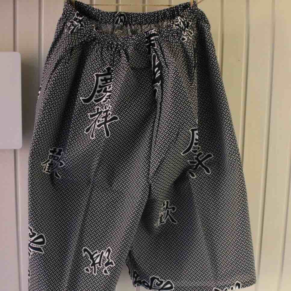 Jinbei Herr, jacka och byxa. Byxan har resår i midjan och lite halvlånga ben som slutar ovanför knät.