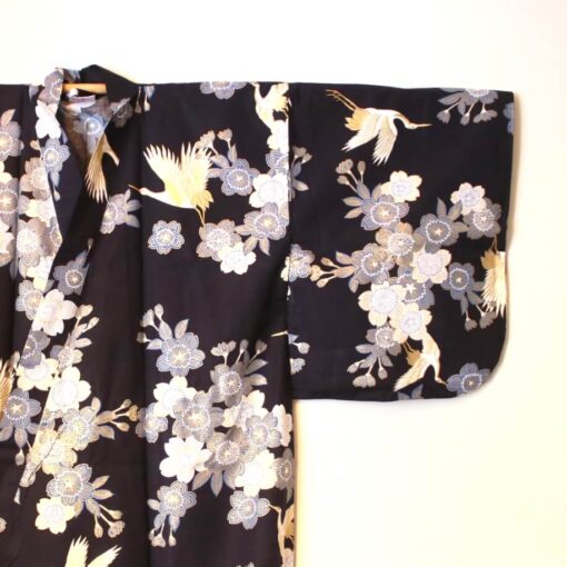 Blå yukata i midnattsblå färg med mönster i traditionell japansk stil. På bilderna ser den svart ut men den är djupt mörk blå.