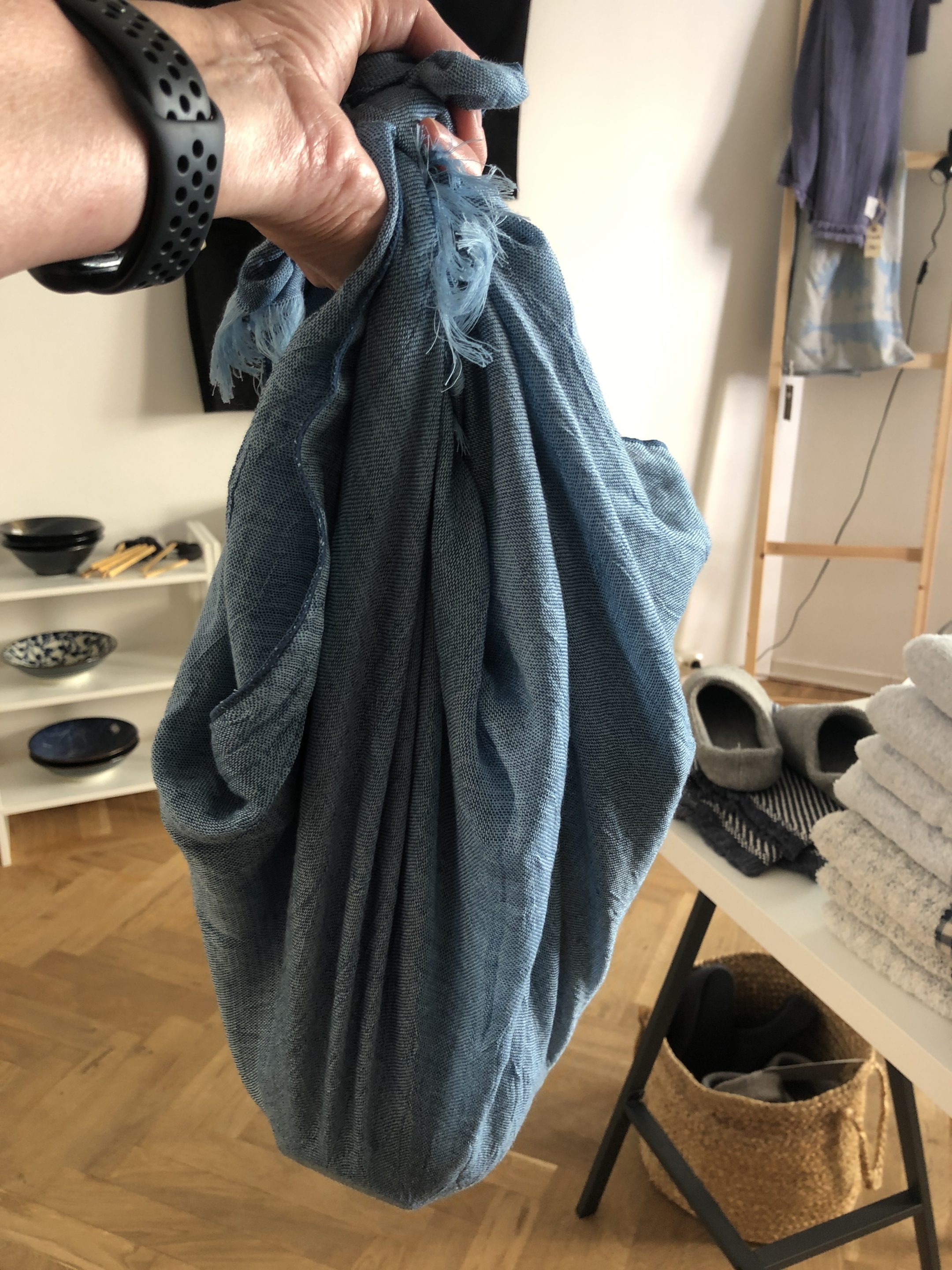 I Japan knyts ett tygstycke till en kasse. Tänk att du viker till en kvadrat och knyter diagonalt med de fyra hörn du har. Nu har du något att bära i. Alltså är det väldigt fiffigt att ha en stor sjal med sig. Vik till en kasse (se bild) stoppa i din picknick och gå ut i solen knyt upp i gräset så har du både duk och filt att sitta på. När du slängt ditt skräp är det bara att svepa sjalen om dig.